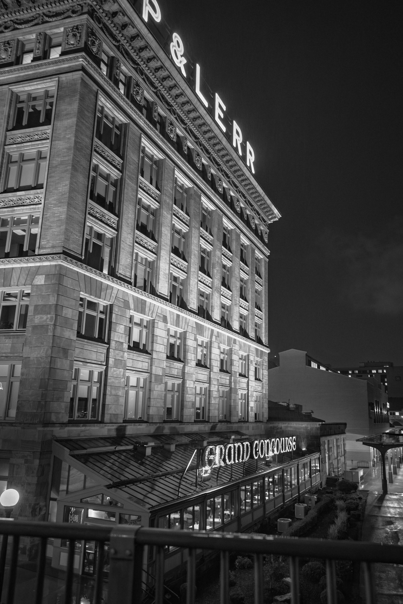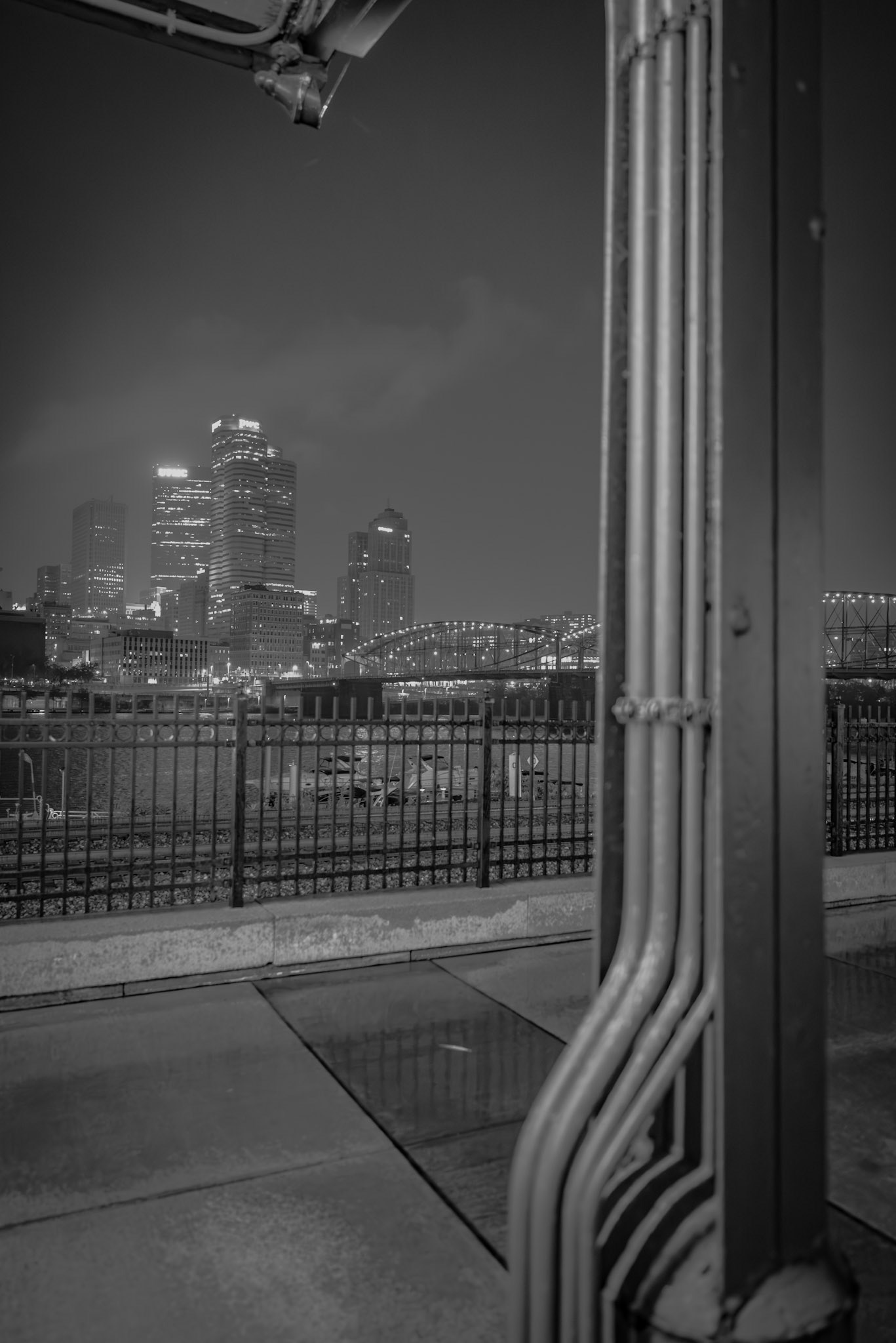 Wrought-Iron Foreground: An art deco flourish catches the eye first, but beyond the fence lies Pittsburgh’s riverfront nightscape—blurring past and present in soft light and steel.