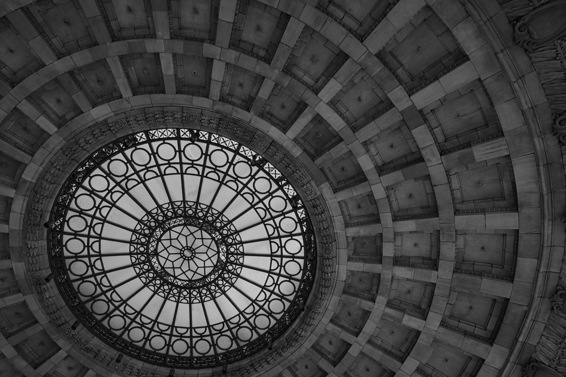 Web of Stone: Looking upward through Union Station’s rotunda reveals a perfect geometry of craftsmanship—like a spider's web cast in stone and iron, holding time in place.
