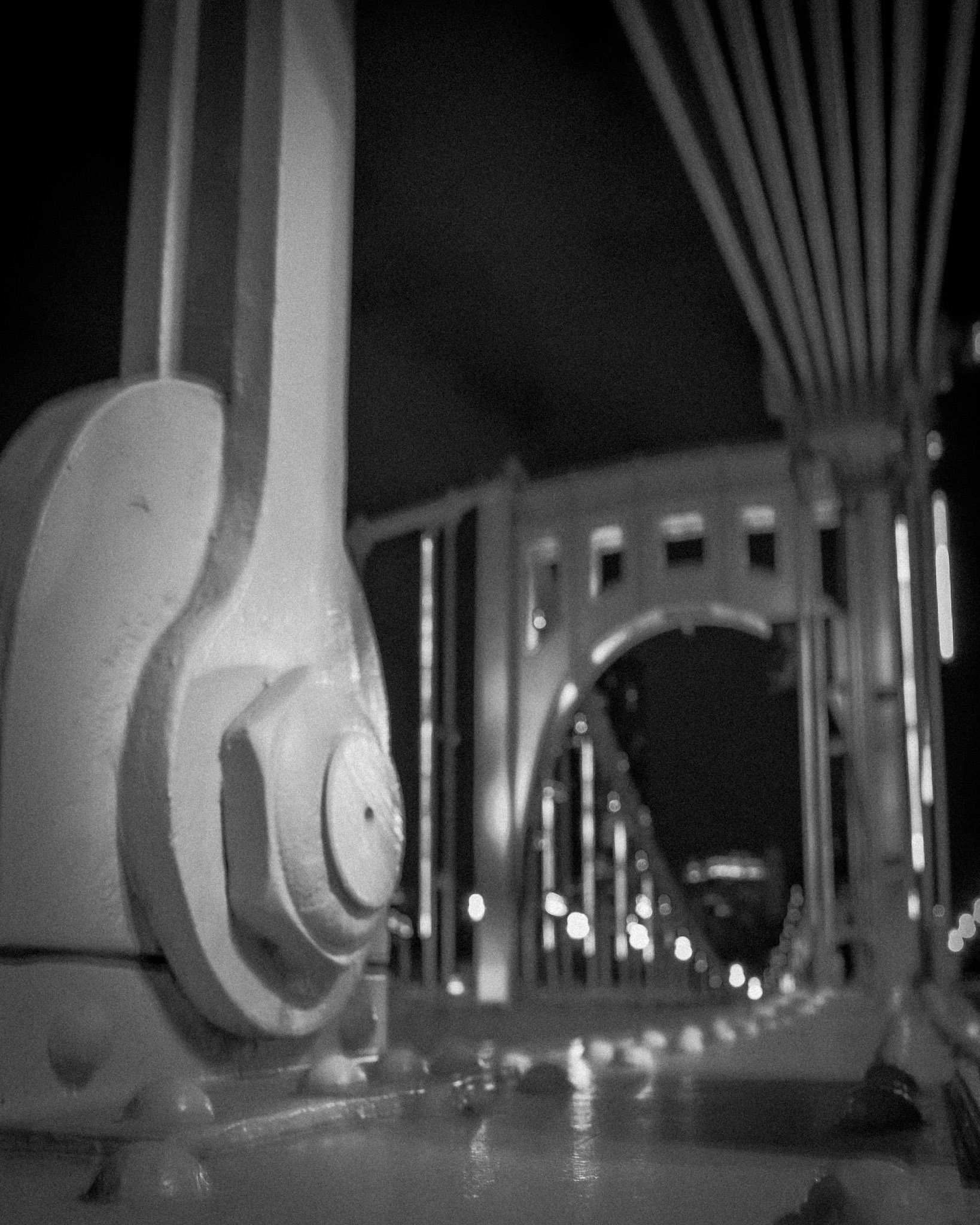 Bolts and Bridges: A single steel bolt becomes monumental when isolated. Behind it, the bridge stretches outward, its tension mirrored in the blur of distant light.