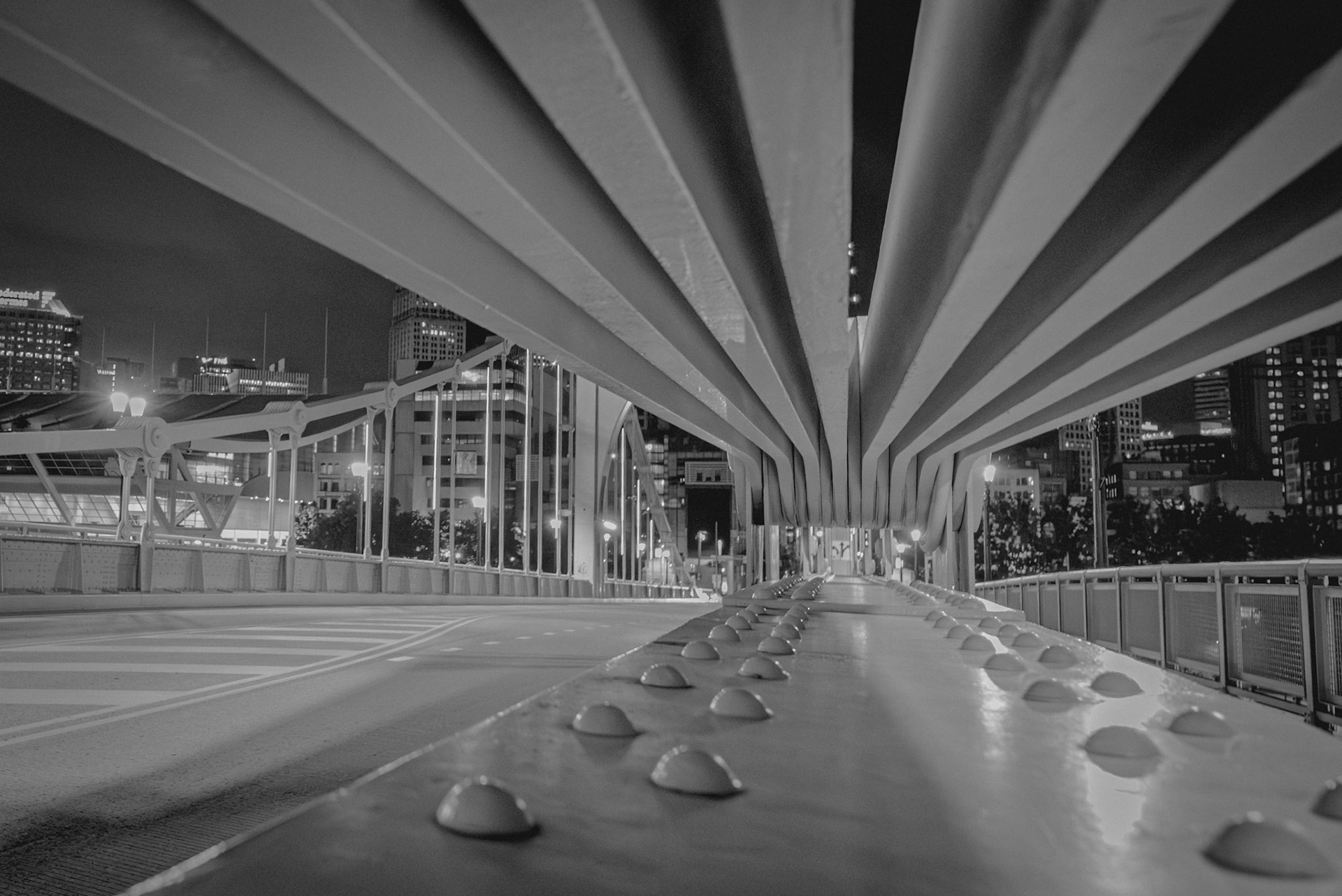 Load-Bearing: Beneath the bridge's steel cables, the bolts and beams draw the eye into forced perspective—guiding us inward, like ribs of a steel cathedral.