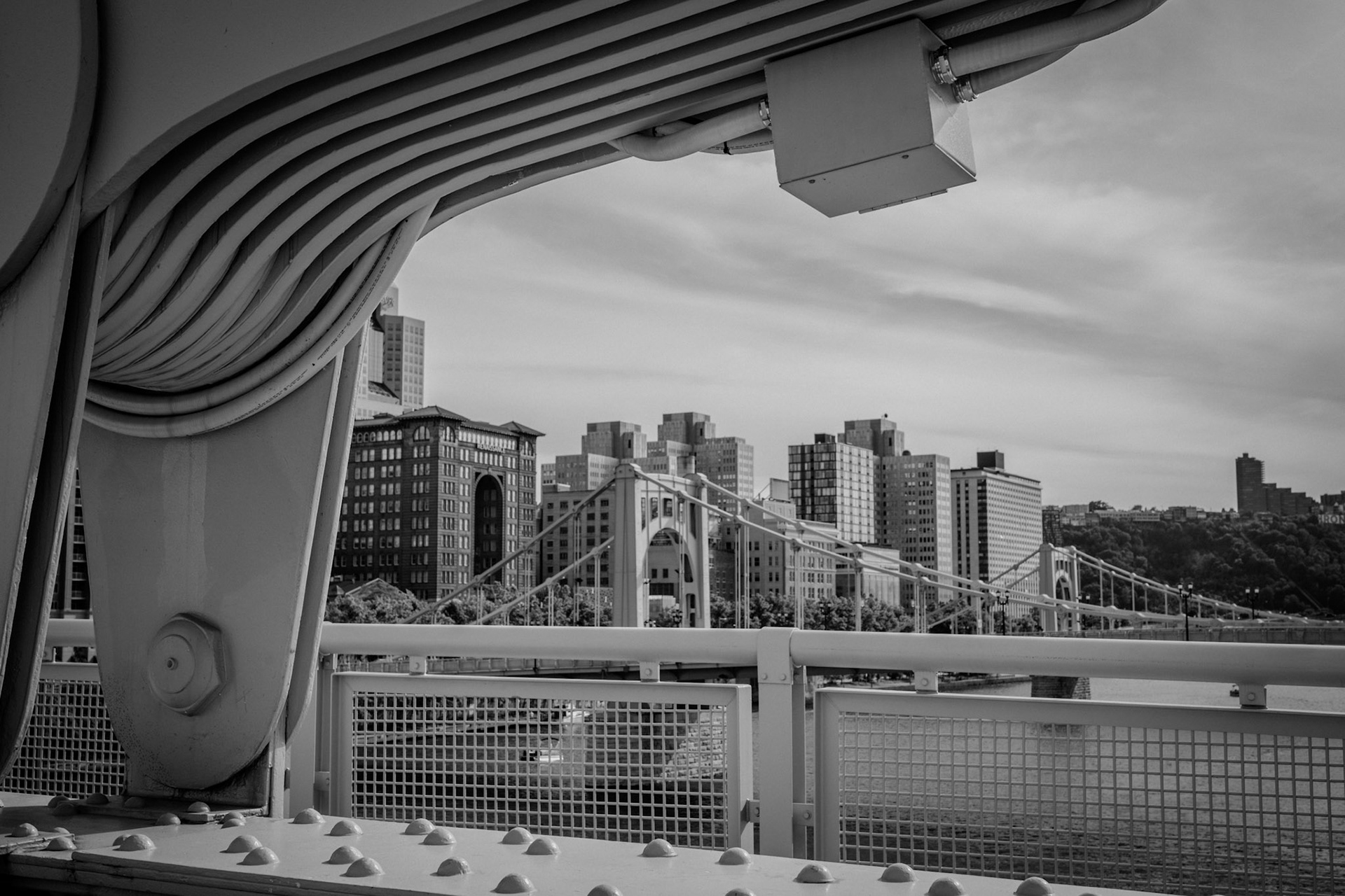 Framed in Steel The city framed through the suspension hardware of the Rachel Carson Bridge. The structure isn’t just support—it’s lens, limit, and threshold.