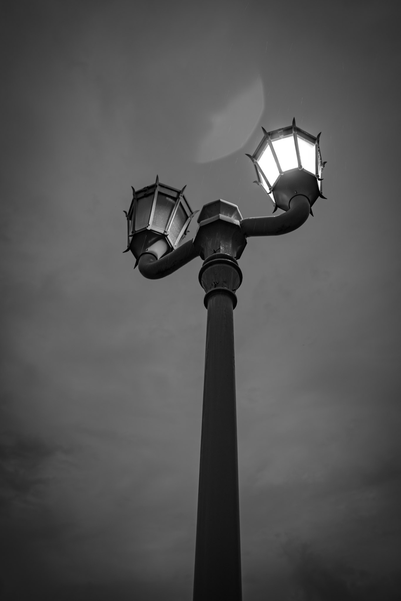 Darkness and Light: A twin-headed lamppost stands against the dusk. One light remains unlit, casting the other into sharper focus. Balance through contrast.